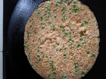 3.放少少油,白饭下锅,翻几翻,放若干生抽、老抽,翻匀;