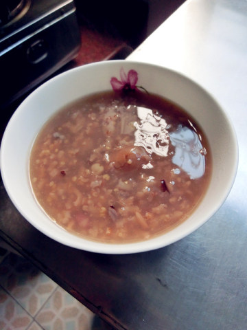 2. 取一深锅,加14杯水,以大火煮开后转小火,加入作法1的材料一起煮40分钟,再放小米及龙眼干继续煮20分钟,最后用冰糖调味即可。
