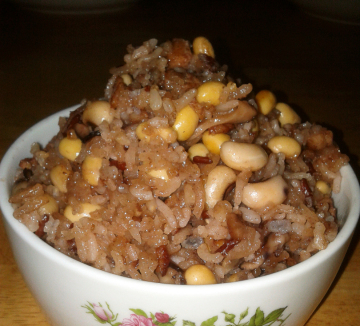 主料:糯米、十谷米、咸肉各一杯,黄豆、眉豆各半杯,香菇五颗,虾米四分之一杯