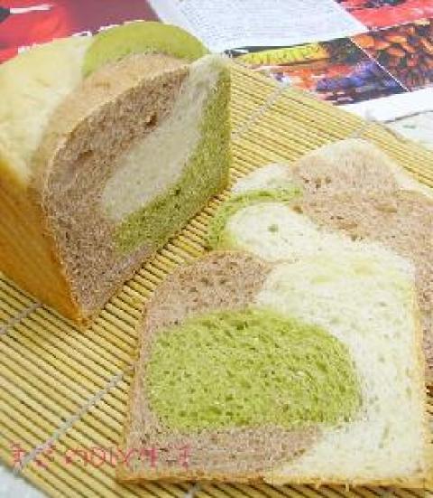 高筋面粉300克,细砂糖20克,盐1/4匙,酵母粉5克,水180克,无盐奶油20克,抹茶粉1/2匙,可可粉1/2匙