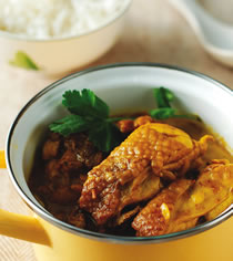 (2)油2大匙热锅,加2大匙面粉和2大匙咖哩粉仔细炒香,再将腌好的鸡肉、马铃薯、红萝卜入锅,加入调味料之后加水淹过材料,盖上锅盖煮至滚透,起锅前再把椰子粉撒上即成。