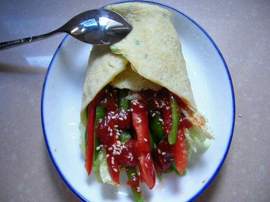 3.再夹入扎肉片,黄瓜条,小青椒条,香菜, 酸甜胡白萝卜丝.