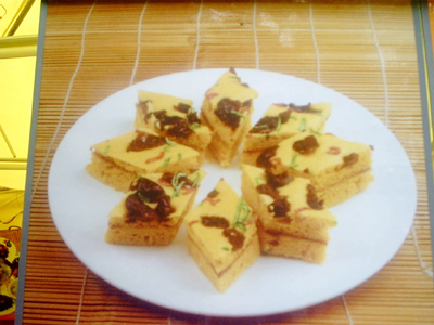 3.这样蒸出来的是一个大大的圆形发糕。吃的时候切成小块就可以了。
