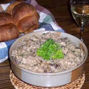 1.取一平底锅,放中火上。加黄油融化。加蘑菇、大蒜、青葱,炒至蘑菇已熟和液体已干。搅拌入鸡汤和白米。加欧芹,盐和胡椒粉调味。将火调小,盖上锅盖煮20分钟即成。