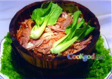 2、木桶入蒸笼以旺火蒸90分钟,撒上香葱,连桶上桌即可。