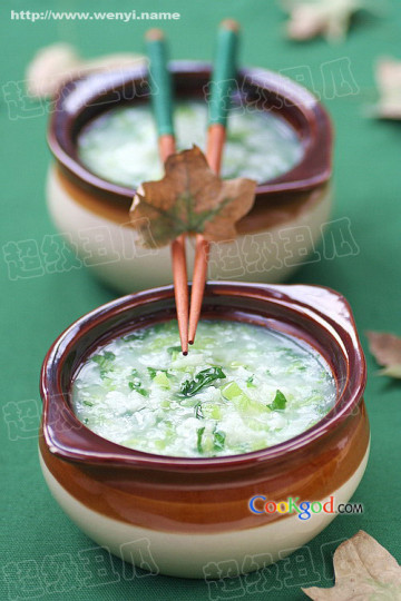 3)煮20分钟待米粒破开后,放入青菜碎,盐,鸡精和香油,搅拌均匀后即可。