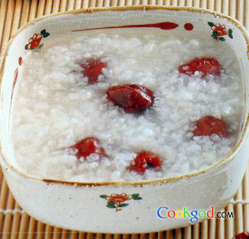 2、红枣洗净、用水泡软,放入粥内同煮,并加入冰糖调味,待红枣软透即可熄火盛出食用。