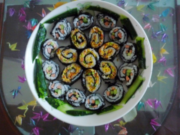 蟹柳(2条), 青瓜(1条),沙拉酱(适量), 寿司饭 , 海苔(1片)