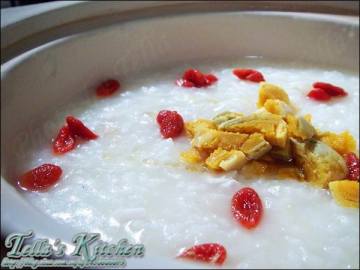 1.用七两米(四两糯米,三两白米)淘净,放水浸泡一小时,放沙锅煮至米粒烂.(大火开后小火煮粥,这样的沙锅粥非常香,好吃.因为是沙锅容易粘锅底,所以要常常搅动,用高压锅就不用搅动)。