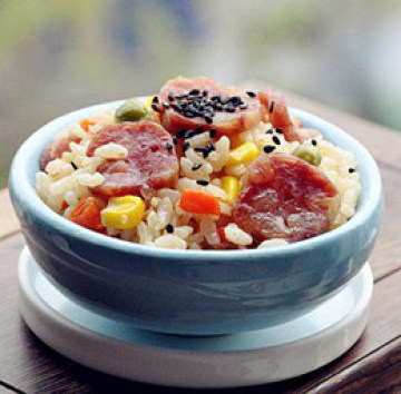 4、腊肠饭:腊肠在煮饭之前用热水冲洗一下,切段并放入米中同煮,饭熟后淋上少许酱油拌匀即可。