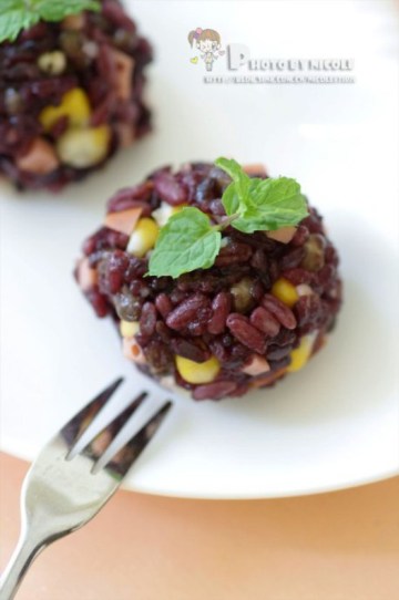 4.将还有余温的杂粮饭与玉米粒和火腿粒混合;