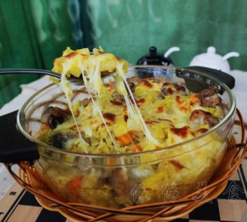 4、炒好的面片上洒奶酪丝用烤箱大火(200度)烤两分钟即可。