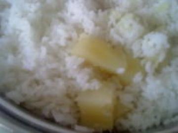 (2)、锅置火上,放入适量清水、粳米、红苕块,共煮成粥。