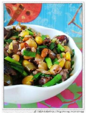 1.将糙米、黑米、枸杞、红枣、玉米粒洗净,放入电饭锅,冷水浸泡3小时以上。红菇清水洗净泡软,用手撕成小块;香菇温水泡软,洗净切丝;春韭洗净,焯水切段。泡椒切碎。
