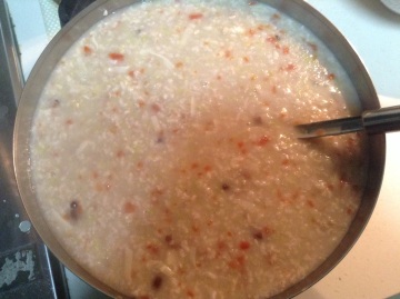 1.玉米酱加进稀饭中搅拌均匀后,加入盐巴调味。