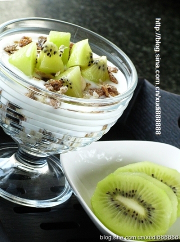 瑞士即食早餐麦片半杯(内含燕麦片、谷物片、葡萄干、葵花籽、碎坚果等),低脂原味酸奶120克,奇异果1个(可以根据自己的喜好选用其他新鲜水果)