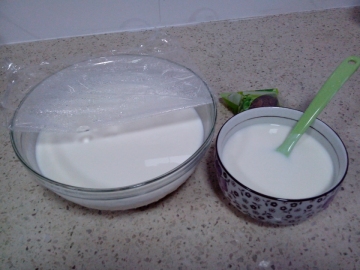 牛奶(1500毫升)、乳酸菌(1克)、开水(1500毫升)、细砂糖(70克)