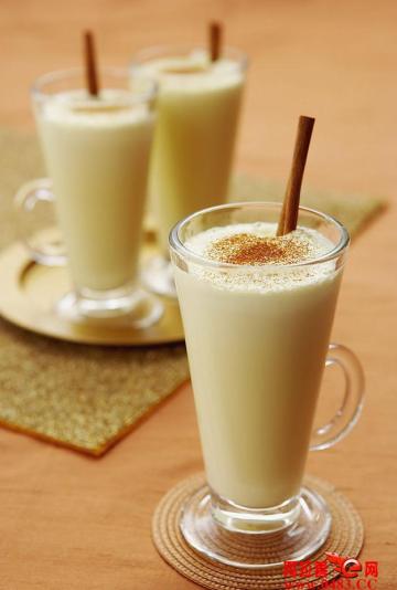 陆续加入1/2汤匙的白兰地及肉桂粉,调和均匀后将奶茶过滤至杯中。