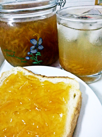 ~做出來的果醬除了塗抹麵包,也可以用冷或热水直接冲泡饮用。味道有点像韓國柚子茶。