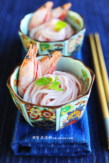 6、把煮熟的面条放入清水中过滤沥干。按照鲣鱼汁:水为1:2的比例兑好汤汁,把面浸在汤汁中,放上北极虾即可食用。