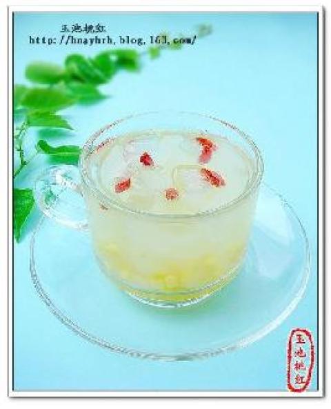 4.凉绿豆银耳水,喝的时候,放有枸杞的冰块即可,可根据自己喜好,放蜂蜜或者冰糖。(如果喜欢放冰糖,可在即将煮好的时候就放入锅内。)
