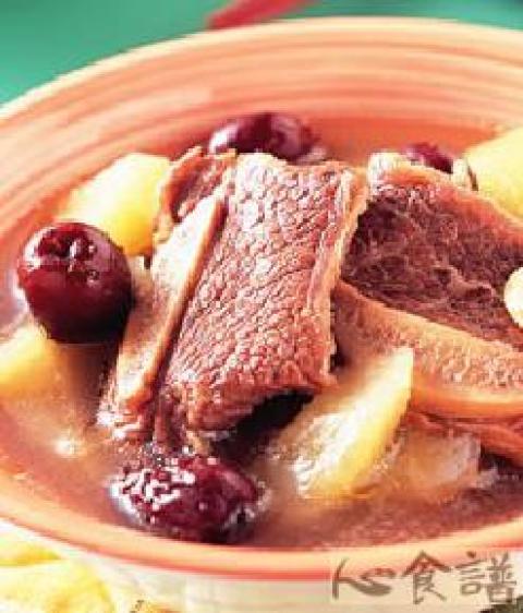 牛小排1斤,青木瓜1颗,牛高汤3500公克,老姜片60公克,红枣12颗,白胡椒粒8粒,盐少许