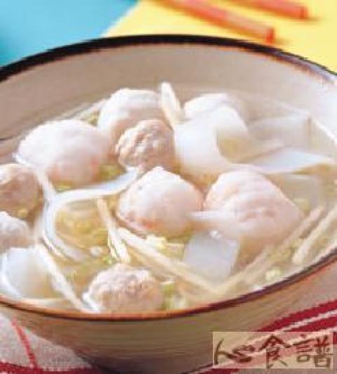 河粉200公克,虾丸3颗,鱼丸4颗,贡丸6颗,芹菜10公克,银芽40公克,高汤500㏄,沙拉油适量,a.盐1/4茶匙,味精1/4茶匙,细砂糖1/6茶匙,白胡椒粉少许,b.香油1/4茶匙