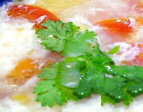 2.炒锅置火上,加猪油,烧热后放入打好的蛋液,炒熟后即倒入高汤500克,汤呈乳白色,烧沸后放入番茄、小虾米、精盐、味精,撇去浮沫,放葱花、淋香油,盛碗即可。