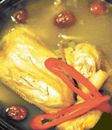 5、食用时,捞出药包、姜、葱不用,把鸡肉切块,猪肉切条,置于盆中,盛上药汤,加少许食盐即成。