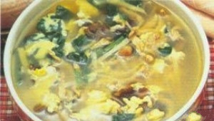 主料:瘦猪肉50克,鸡蛋1个,菠菜50克,水发木耳5克,水发笋片25克,水发海米10克,酱油,精盐,味精,香油,高汤各适量。