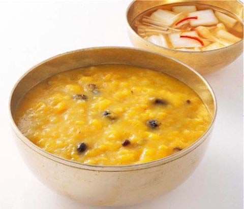 3) 把颳的南瓜繼續放在平鍋裡煮﹐等小豆和豌豆煮爛糊時放糯米 面和糯谷面搖勻。太稀時也可以加一點面粉。用鹽調味﹐並為了防止沾鍋底邊搖邊煮﹐30分後把火調弱﹐燜一燜。