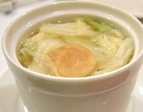 ②植物油倒入热锅,放入干贝、大白菜、调料、高汤、豆腐烧煮5分钟勾芡,放上麻油即可。