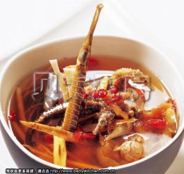 海龙:生活在近海的小型鱼类,海龙比海马更加“苗条”,身体细长呈鞭形,细瘦的身体完全为骨节状。海龙与海马功效相仿,同样含有丰富的天然雄性激素,但效力比海马更强。海龙可在药店中购得,此汤水用量约花费20元。