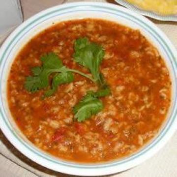 2.用个搅拌机,将西红柿、洋葱、蒜、一半的鸡汤和胡荽搅拌均匀。然后倒到燕麦干的锅里。再倒入剩下的一半鸡汤,煮沸。加点盐,上盖,再烧15分钟即可。