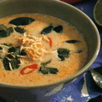 5.点缀用的椰丝可根据需要放在煎锅里烘烤,再切出一些红辣椒丝。汤煮好后,取出良姜,倒入预热的汤碗。用莱姆叶、椰丝、红辣椒以及香菜点缀,立即上桌。
