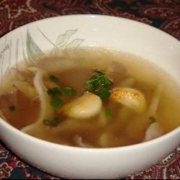 菜油2茶匙,蒜2瓣,切成片,凤尾菇200克,蟹肉菇100克,盐1捏,鸡汤300毫升,开水600毫升,白胡椒粉1/8茶匙,盐1/4茶匙,葱花1/2茶匙