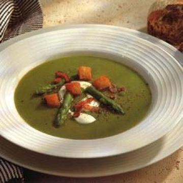 7.把汤盛入4个预热过的汤碗中,每碗浇入两茶匙鲜奶油,撒上腌熏猪肉片、炸面包块和剩下的芦笋尖,再撒一些现磨黑胡椒。