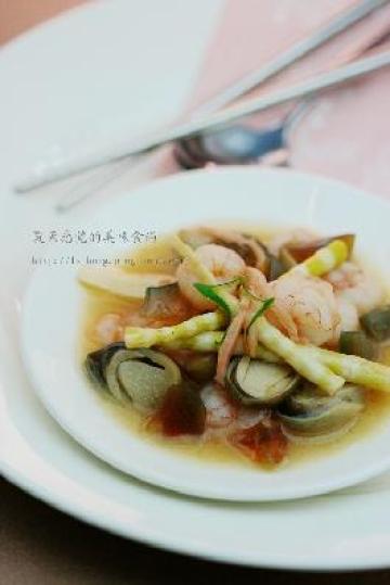3 起油锅,下虾仁、草菇、火腿丝翻炒,加盐,加高汤煮沸后转中小火略煮几分钟,然后下皮蛋和笋,炒匀装盘。