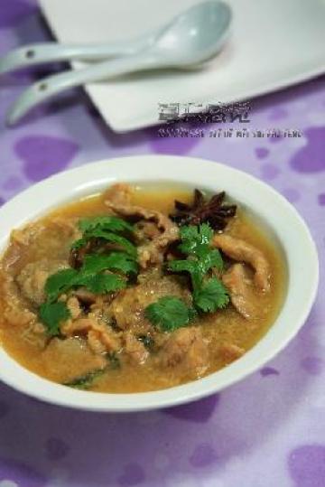 4 蒸好后取出碗,把蒸肉的汤汁倒在锅里,加胡椒粉,盐,醋调味,生粉勾芡,汤开后把肉片倒进去,撒上香菜