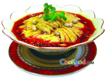 三黄仔鸡250克,罗汉笋50克,熟芝麻5克,油炸去皮花生40克,香菜15克。调料特制红油(制法同上上签)80克,青花椒油40克,特制汁200克,料酒5克,老姜10克,葱段15克,盐7克,黄酒25克。