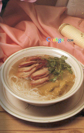 3、煮熟的濑粉置碗内铺好,上面摆放好叉烧、烧鹅、香菜等,再将刚才煮好的汤淋上,并撒上芫荽和白芝麻即可。
