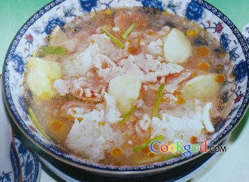 4.炒锅注入花生油烧至五成热,放入肉片、老姜片炒熟,倒入肉汤烧开,小火煨5分钟,加入精盐、酱油、味精、葱花即可。