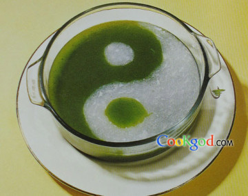3.装盘后,用绿叶汁点缀成太极形状即可。