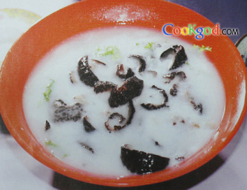 3、炒锅内加猪油,放入葱、姜片炝香,加入余下的奶汤、料酒、精盐烧开,下入海参,再烧开后加味精、胡椒粉,淋上鸡油,盛入用奶汤氽过的葵菜碗内即成。