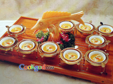 清汤竹笙鱼翅、清汤汆鱼面、清汤橘瓣鱼汆、灌汤龙虾蛋、明珠奶汤桂鱼