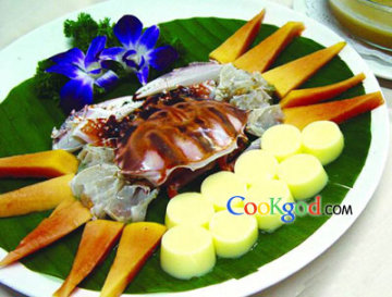 浓汤与活蟹组合增加鲜味,放入木瓜后更增加了汤汁的香气,即席烹制可烘托用餐气氛。这道菜的创意从现在比较流行的“堂灼菜”改进而来,由服务员为客人现场操作。