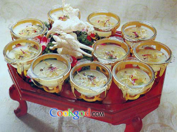 (2)、将汤罐洗净,放入烧开的清汤及三七粉、鹿筋、精盐、味精,用油纸将汤罐封严,蒸l小时左右,下屉即可。