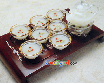 此菜采用米汤做菜,调制手法特别,加入菠菜汁,使菜品更富营养。