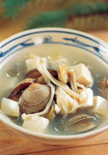 高汤15大匙 胡椒粉1小匙 精盐1小匙 金针菇150克 蛤蜊300克 豆腐100克 生姜1小块