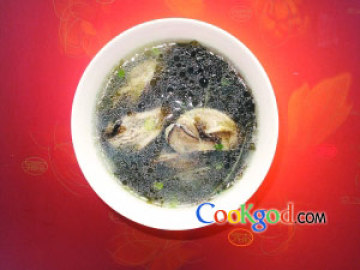 4. 煮沸清水,放半汤匙油,下生蚝煮滚,下紫菜和姜丝,稍煮开,下盐、胡椒粉,撒入葱粒即可食用。